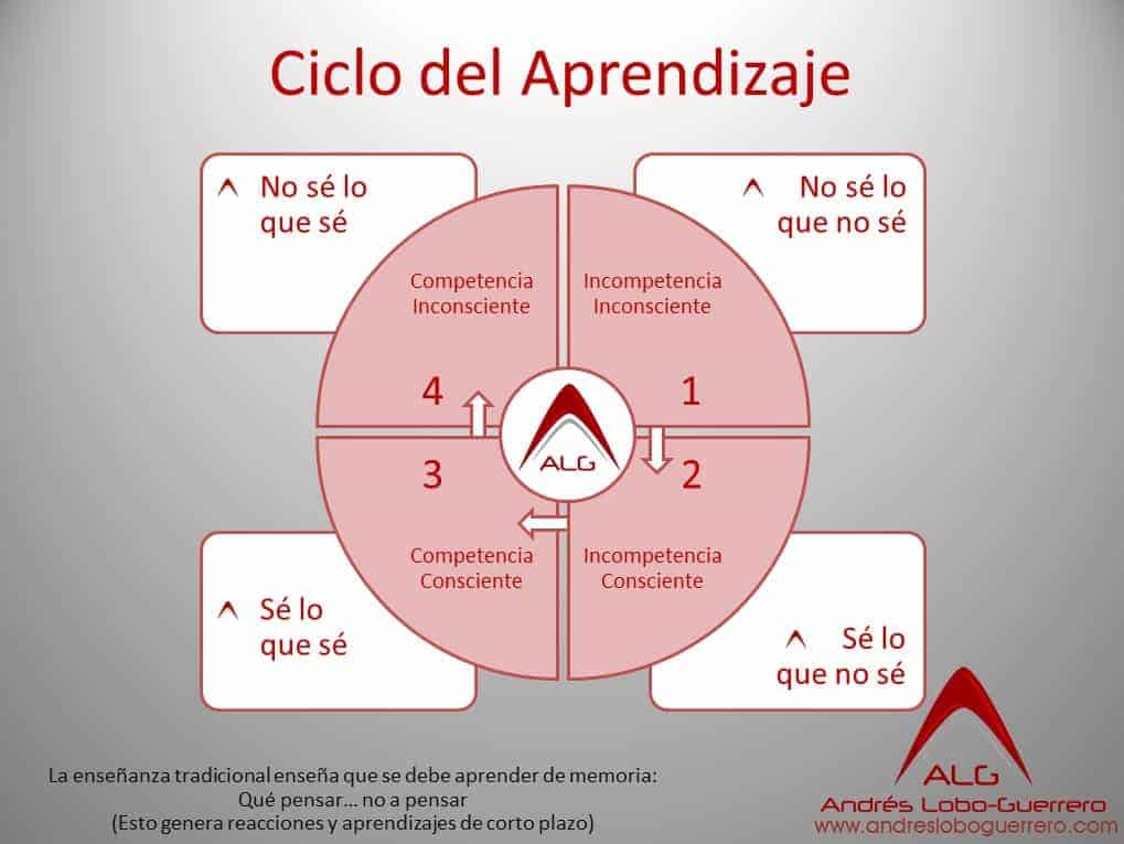 Hemos pasado de una persona que no sabĂ­a lo que no sabĂ­a (un Incompetente Inconsciente), a una persona que ya sabe lo que quiere pero aun no lo puede hacer (un Incompetente Consciente) a na tercera fase del Ciclo de Aprendizaje donde esta persona ya sabe lo que sabe. (es un Competente Consciente)